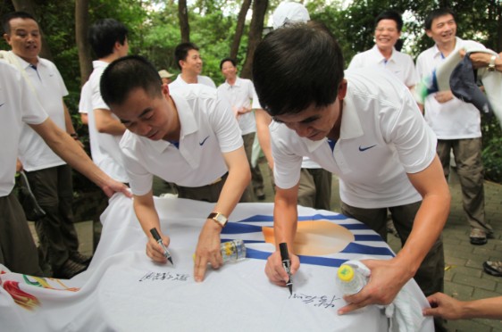 登山開始了,大家隨意分成一隊隊,沿著山路臺階拾級而上,穿行在青山綠樹間,吮吸著夾帶泥土味的新鮮空氣,邊輕松行走,邊交流工作心得,談笑間便來到了臨近山頂?shù)男蓓脚_。一面印有特發(fā)核心價值觀“全員職業(yè)化,成就美好生活”的司旗早已擺放好在石桌上,等候大家簽名祝福。劉愛群董事長率先提筆寫下“特發(fā)的明天更美好”的祝福語,深情表達特發(fā)人對美好未來的熱切期盼。陸續(xù)登上平臺的特發(fā)人紛紛留下自己對特發(fā)集團的美好心愿和祝福:“大展宏圖”、“正是特發(fā)三十年,創(chuàng)業(yè)當(dāng)趁好時光”、“明天風(fēng)景更好”、“特發(fā)集團,一飛沖天”、“祝愿特發(fā),三十而立,輝煌再現(xiàn)”……共同祝愿特發(fā)集團在“全員職業(yè)化,成就美好生活”核心價值觀的引領(lǐng)下,在未來的發(fā)展道路上闊步前進,基業(yè)長青!