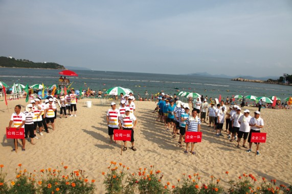 比賽越來越精彩,競爭越來越激烈。最后一個項目是障礙接力。這項比賽刺激好玩,氣氛活躍,觀賞性強,對運動員的個人體能及技術提出了較高的要求,對團隊協(xié)作完成任務的能力也是一個考驗。隨著主持人一聲令下,運動員們迅速奔向海邊取水,不顧“濕身”,控制好的就來個“蜻蜓點水”,控制稍遜的就直接和大海來個“擁抱”。返回的時候是要吃點苦頭的,面對不足一米高的障礙網,有匍匐前進的,有奮力爬行的,有蹲著挪移的,“洋相”盡出,令人捧腹。賽場上高潮迭起,戰(zhàn)火彌漫,場邊觀眾笑聲、加油聲、歡呼聲、喝彩聲響成一片,熱鬧非凡。經過激烈的角逐,企業(yè)一隊拔得頭籌,公司一隊、公司二隊、企業(yè)二隊分獲二、三、四名。