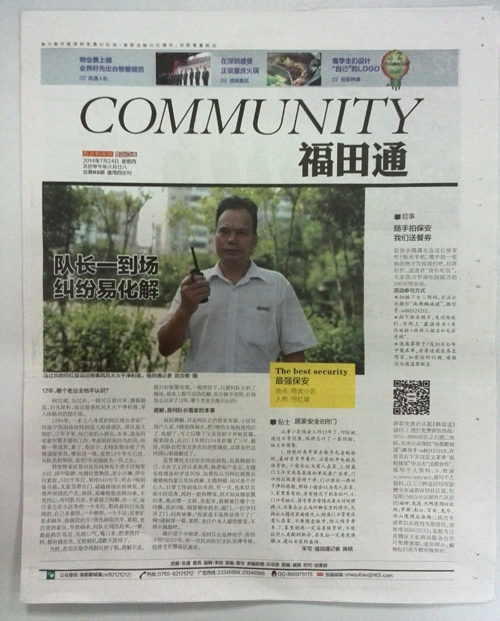 在2014年7月24日《南方都市報(bào)》出版發(fā)行的第92期深圳社區(qū)報(bào)《鵬城通》的“福田通”版中,刊出了“最強(qiáng)保安”的專(zhuān)題報(bào)道,特發(fā)物業(yè)公司特發(fā)小區(qū)管理處保安隊(duì)長(zhǎng)——何紅斌正是這一期報(bào)道的主人公。