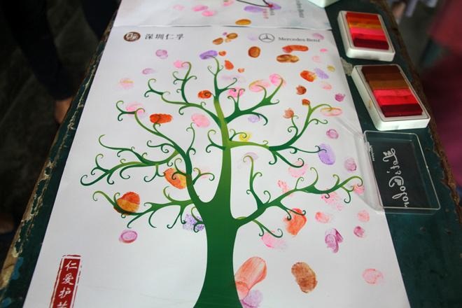 在參觀了整個小學的基礎(chǔ)設(shè)施后,大家參加了學校的升旗儀式,少先隊員為大家佩戴了紅領(lǐng)巾;大家還一起“按拇指印,共筑希望樹”,家重溫少兒時的美好時光。
