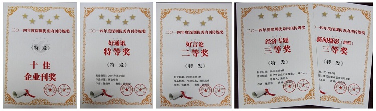 12月15日,在2014年度深圳內(nèi)刊界學(xué)習(xí)交流暨優(yōu)秀內(nèi)刊傳媒獎頒獎大會上,《特發(fā)》月刊和《華僑城》、《寶安風(fēng)》、《華安保險》、《京基》、《鴻橋》、《深業(yè)》、《城筑》、《勁嘉》、《雅昌》,被市出版業(yè)協(xié)會、深圳晚報社授予深圳市“十佳”企業(yè)刊稱號,這是《特發(fā)》月刊連續(xù)六年獲“深圳優(yōu)秀內(nèi)刊傳媒獎”最高榮譽(yù)。同時,集團(tuán)張俊林董事長的《懷念母親》獲“好通訊”特等獎;張建民總經(jīng)理的《開放心態(tài),擁抱成功》獲“好言論”二等獎;張正治的《用優(yōu)秀企業(yè)文化凝聚人、評任人、培養(yǎng)人、激勵人》獲“經(jīng)濟(jì)論壇”三等獎,《集團(tuán)迎新年聯(lián)歡活動剪影》獲“新聞攝影(組照)”三等獎。