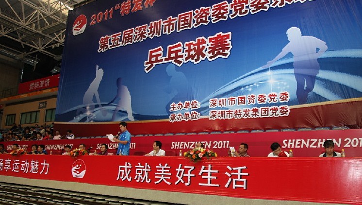 開(kāi)幕式于10月29日上午8:30舉行。市國(guó)資委黨委書記柏立新,特發(fā)集團(tuán)黨委書記、董事長(zhǎng)劉愛(ài)群、黨委副書記、總經(jīng)理施長(zhǎng)躍,國(guó)資委黨辦主任李明、副主任張曉中、唐明通,以及國(guó)資委系統(tǒng)企業(yè)的領(lǐng)導(dǎo)出席開(kāi)幕式。開(kāi)幕式由集團(tuán)總經(jīng)理施長(zhǎng)躍主持。此時(shí)的羅湖體育館一派歡快、濃烈的氛圍:主席臺(tái)正面高樹(shù)印有本次比賽徽標(biāo)和“2011‘特發(fā)杯’第五屆深圳市國(guó)資委黨委系統(tǒng)乒乓球賽”字樣的巨幅背景板,四周掛滿國(guó)資委和系統(tǒng)各企業(yè)的旗幟與祝比賽圓滿成功的條幅,以及“暢享運(yùn)動(dòng)魅力,成就美好生活”、“樹(shù)競(jìng)技風(fēng)尚,展國(guó)企風(fēng)采”等標(biāo)語(yǔ),各單位啦啦隊(duì)和觀眾坐滿看臺(tái)。伴隨著熱烈歡快的運(yùn)動(dòng)員進(jìn)行曲,來(lái)自國(guó)資委系統(tǒng)21家單位的22支代表隊(duì),在美麗端莊的引導(dǎo)員帶領(lǐng)下,隨著高舉國(guó)資委旗幟的旗手、護(hù)旗手依次入場(chǎng),隊(duì)員們意氣風(fēng)發(fā),精神飽滿,步伐矯健,隊(duì)列整齊。在全體起立奏唱國(guó)歌、莊嚴(yán)的升國(guó)旗儀式后,集團(tuán)董事長(zhǎng)劉愛(ài)群和國(guó)資委黨委書記柏立新分別代表承辦方和組委會(huì)先后致辭。